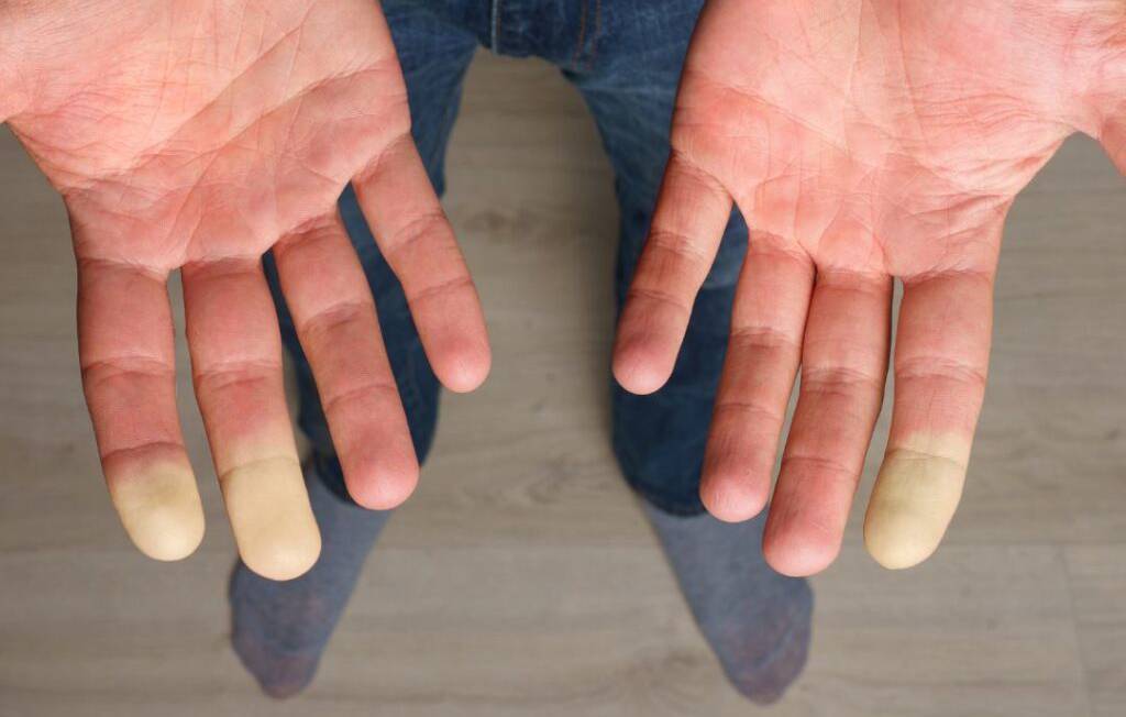 - Spremembo barve kože: najprej pobleditev (bela), nato pomodritev (modra) in na koncu pordelost (rdeča), ko se pretok ponovno vzpostavi.